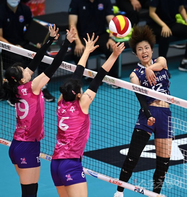 26일 경기도 의정부체육관에서 열린 ‘2021 의정부·도드람컵 프로배구대회’ 여자부 순위결정전 한국도로공사와 흥국생명 경기에서 한국도로공사 문정원이 흥국생명의 블로킹 사이로 스파이크를 날리고 있다.