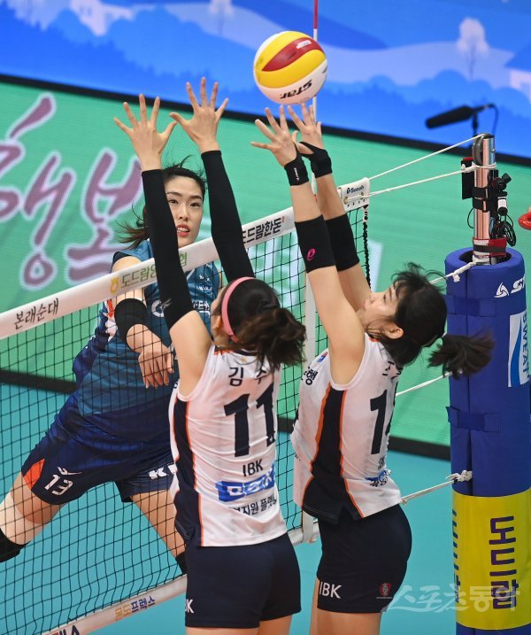 26일 경기도 의정부체육관에서 열린 ‘2021 의정부·도드람컵 프로배구대회’ 여자부 순위결정전 GS칼텍스와 IBK기업은행 경기에서 GS칼텍스 최은지가 IBK기업은행의 블로킹 사이로 스파이크를 날리고 있다.