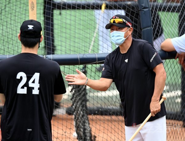경기 전 SSG 1군 벤치코치로 선임된 조원우 코치가 오태곤과 이야기를 나누고 있다.