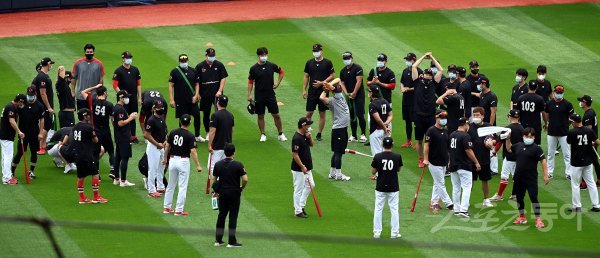 26일 경기도 수원 kt위즈파크에서 ‘2021 신한은행 SOL KBO리그’ kt 위즈와 SSG 랜더스의 경기가 열린다. 경기 전 SSG 선수들이 외야에서 미팅을 가지고 있다.
