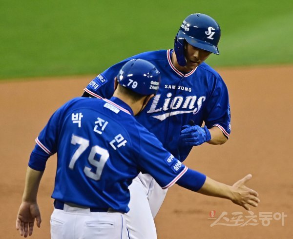 26일 서울잠실야구장에서 ‘2021 신한은행 SOL KBO리그’ LG 트윈스와 삼성 라이온즈의 경기에서 1회초 2사 삼성 구자욱이 선제 우월 솔로 홈런을 쳐낸 뒤 3루코치와 기쁨을 나누고 있다.