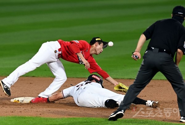 2회말 무사 1루에서 SSG 안상현이 kt 배정대의 2루 도루를 막기위해 송구를 받으려다 볼을 맞고 있다.