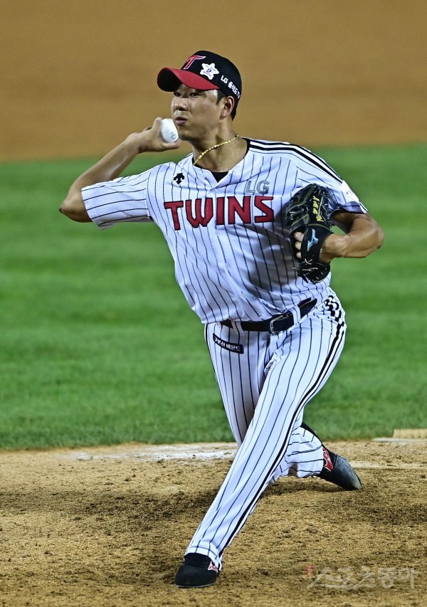 26일 서울잠실야구장에서 ‘2021 신한은행 SOL KBO리그’ LG 트윈스와 삼성 라이온즈의 경기에서 7회초 LG 정우영이 교체로 마운드에 올라 역투하고 있다.