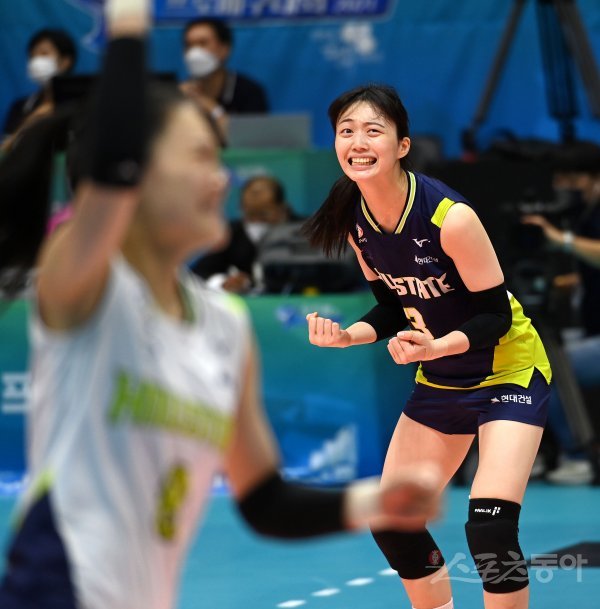 29일 경기도 의정부체육관에서 열린 ‘2021 의정부·도드람컵 프로배구대회’ 여자부 결승전 현대건설과 GS칼텍스 경기에서 현대건설 김다인이 서브 득점에 성공한 후 환호하고 있다.