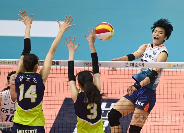 29일 경기도 의정부체육관에서 열린 ‘2021 의정부·도드람컵 프로배구대회’ 여자부 결승전 현대건설과 GS칼텍스 경기에서 GS칼텍스 문지윤이 현대건설의 블로킹 사이로 스파이크를 날리고 있다.