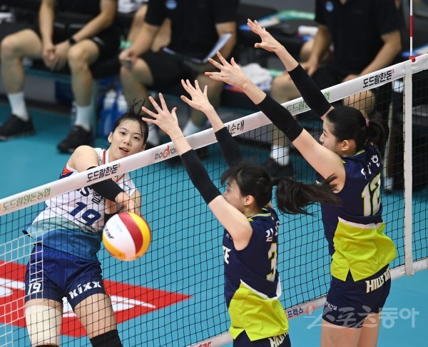 29일 경기도 의정부체육관에서 열린 ‘2021 의정부·도드람컵 프로배구대회’ 여자부 결승전 현대건설과 GS칼텍스 경기에서 GS칼텍스 유서연이 현대건설의 블로킹 사이로 스파이크를 날리고 있다.
