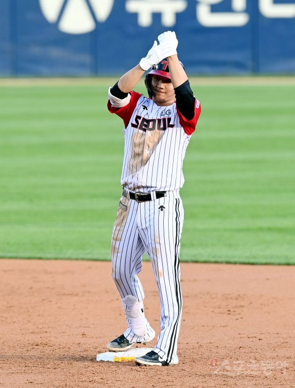 2회말 2사 1, 3루에서 LG 문보경이 2타점 2루타를 날린 뒤 세리머니를 펼치고 있다.