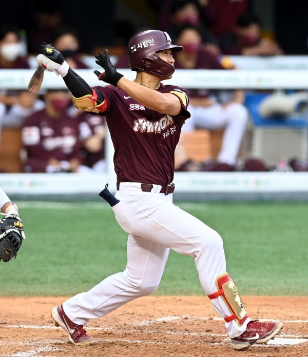 4회초 1사 1루에서 키움 송성문이 투런 홈런을 쏘아 올리고 있다.