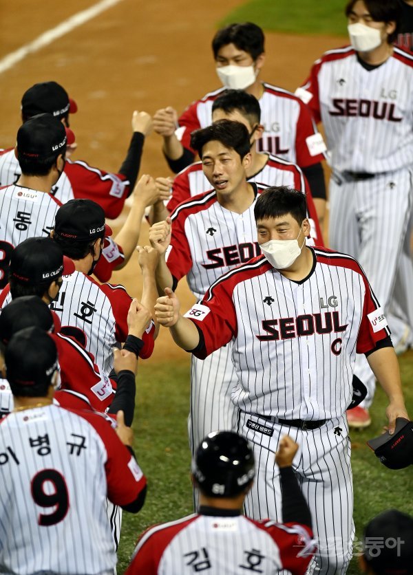 LG가 키움을 상대로 11-2로 승리하며 4연승을 기록한 뒤 선수들이 그라운드에서 코치들의 환영을 받고 있다.