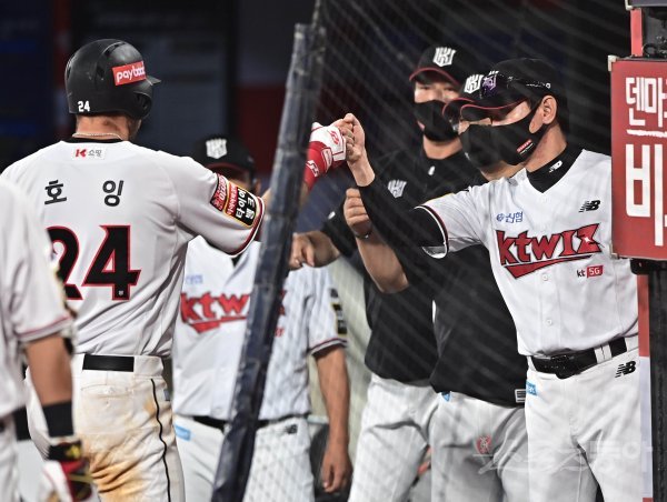 29일 경기도 수원KT위즈파크에서 ‘2021 신한은행 SOL KBO리그’ KT 위즈와 삼성 라이온즈의 경기에서 6회말 2사 KT 호잉이 우월 솔로 홈런을 쳐낸 뒤 이강철 감독의 축하를 받고 있다.
