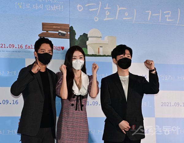 배우 이완, 한선화, 김민근 감독이 31일 서울 광진구 자양동 롯데시네마 건대입구점에서 열린 영화 ‘영화의 거리’ 언론시사회 무대인사에서 포즈를 취하고 있다.