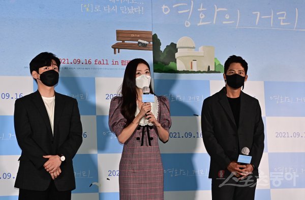 김민근 감독, 배우 한선화, 이완이 31일 서울 광진구 자양동 롯데시네마 건대입구점에서 열린 영화 ‘영화의 거리’ 언론시사회 무대인사에서 개봉 소감을 말하고 있다.