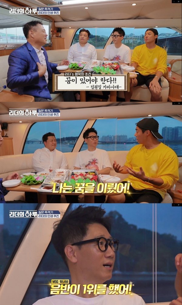 31일 방송된 '리더의 하루'에서는 20억 대 럭셔리 요트에서 하루를 마무리하는 500억 매출의 컴포트화 1위 브랜드 김원길 대표와 지석진, 윤정수, 강남의 모습이 그려졌다.