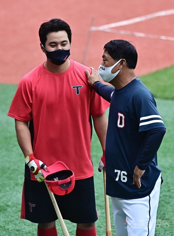 1일 서울 잠실야구장에서 열린 ‘2021 신한은행 SOL KBO리그’에서 두산 베어스와 KIA 타이거즈의 더블헤더 1차전 경기에 앞서 KIA 한승택과 두산 이정훈 코치가 이야기를 하고 있다.