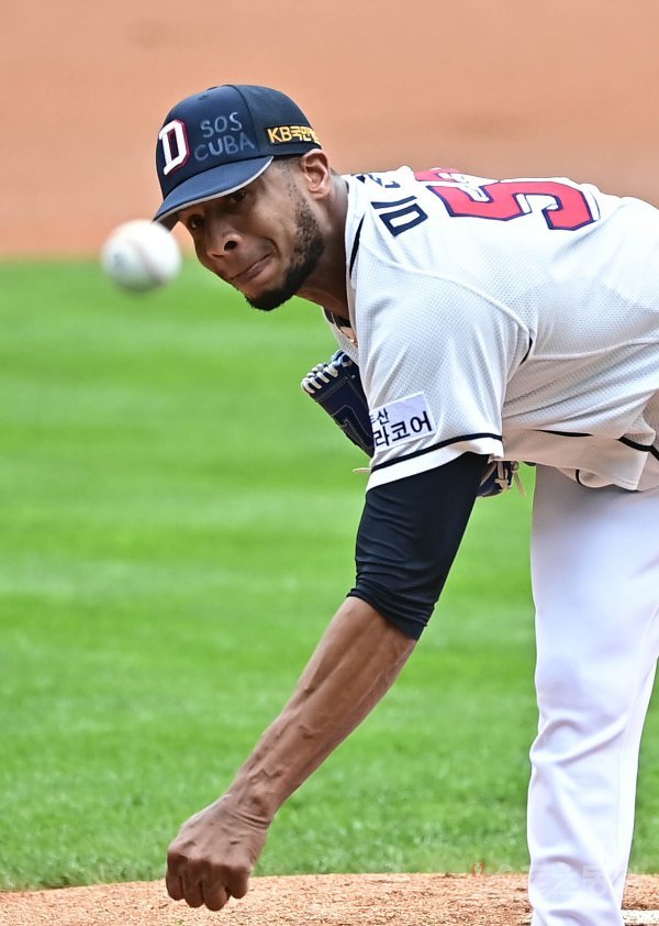1일 서울 잠실야구장에서 열린 ‘2021 신한은행 SOL KBO리그’에서 두산 베어스와 KIA 타이거즈의 더블헤더 1차전 경기에서 선발 투수로 마운드에 오른 두산 미란다가 역투하고 있다.