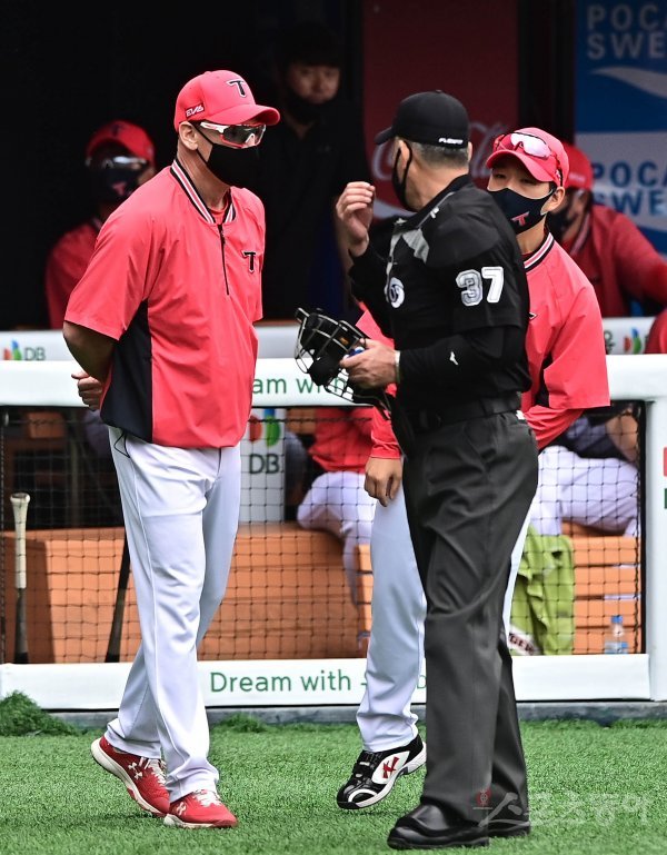 1일 서울 잠실야구장에서 열린 ‘2021 신한은행 SOL KBO리그’에서 두산 베어스와 KIA 타이거즈의 더블헤더 1차전 경기에서 4회초 공격이 무산된 후 KIA 윌리엄스 감독이 심판에게 어필을 하고 있다.