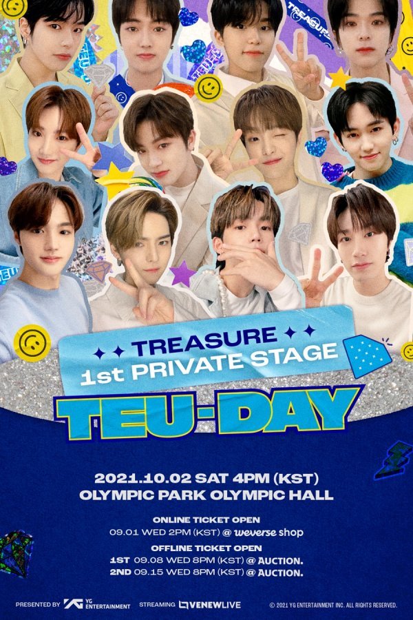 트레저는 10월 2일 서울 방이동 올림픽홀에서 'TREASURE 1ST PRIVATE STAGE [TEU-DAY]'를 개최한다.