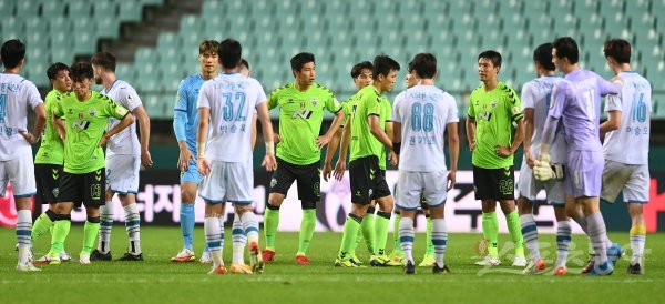 1일 전주월드컵경기장에서 열린 프로축구 ‘하나원큐 K리그1 2021’ 전북 현대와 포항 스틸러스 경기에서 0-1로 패한 전북 선수들이 아쉬워하고 있다.