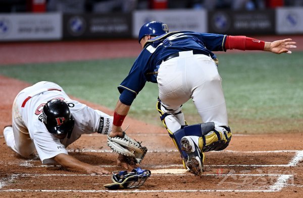 6회말 1사 1, 3루에서 내야땅볼 때 SSG 3루 주자 이현석이 홈으로 파고 들었으나 NC 김태군에게 태그 아웃되고 있다.