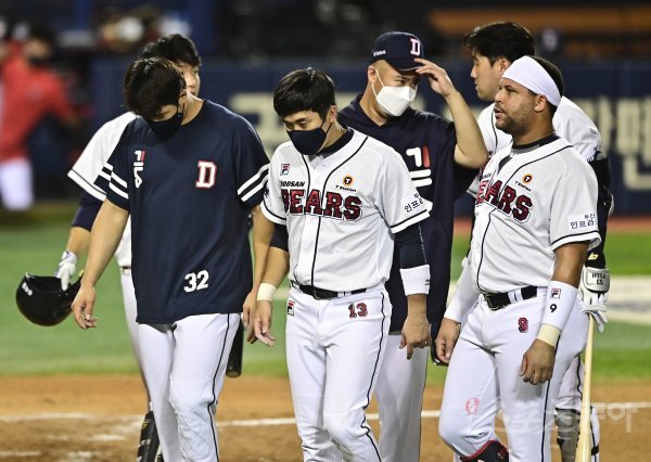 1일 서울 잠실야구장에서 열린 ‘2021 신한은행 SOL KBO리그’에서 두산 베어스와 KIA 타이거즈의 더블헤더 2차전 경기에서 두산이 KIA에 2-3으로 패한 뒤 선수들이 고개를 숙인 채 더그아웃으로 향하고 있다.