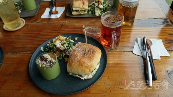 디톡스 스무디, 쿠스쿠스 샐러드, 버섯 샌드위치, 그리고 허브 티로 구성된 제주 901의 비건푸드 브런치. 제주|김재범 기자 oldfield@donga.com