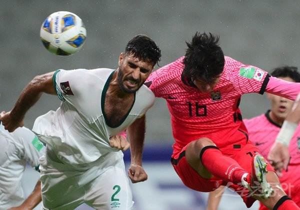 2일 서울월드컵경기장에서 열린 ‘2022 FIFA 카타르 월드컵’ 아시아지역 최종예선 A조 1차전 한국과 이라크의 경기에서 한국 황의조가 이라크 수비수 앞에서 헤딩을 하고 있다.
