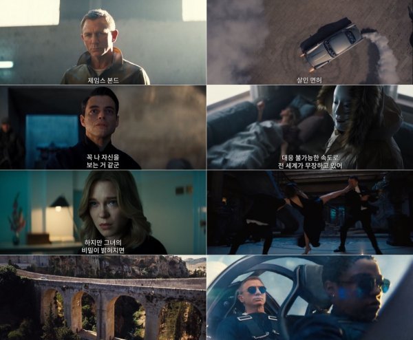 ‘007 노 타임 투 다이’ 예고편 속 캐릭터들의 활약 역시 색다르다. 위험에 빠진 전 세계를 구해야 하는 상황에 직면한 ‘제임스 본드’는 “우리가 하지 않으면 세상이 끝날 거야“라고 말하며 함께 해온 요원들은 물론, 새롭게 합류한 팀원들과 함께 미션을 끝내기 위해 고군분투한다. 이 과정에서 역대급 카체이싱 액션 시퀀스는 물론, 고공 헬기씬, 다리를 뛰어내리는 리얼 액션, 그리고 전매특허 총격씬까지 단 한 순간도 눈을 뗄 수 없는 놀라운 액션이 가득하다. 특히 새롭게 합류한 ‘노미’ 역의 라샤나 린치와 ‘팔로마’ 역의 아나 디 아르마스 역시 강렬한 액션을 선보이며 다양한 캐릭터들의 활약까지 기대감을 높인다.