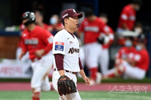 5일 서울 고척스카이돔에서 ‘2021 신한은행 SOL KBO리그’ 키움 히어로즈와 SSG 랜더스의 경기가 열렸다. 5회초 무사 만루에서 키움 김성민이 밀어내기 볼넷을 허용한 뒤 아쉬워하고 있다. 고척 | 김민성 기자 marineboy@donga.com