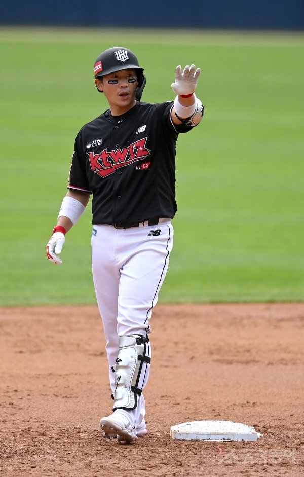 5일 서울 잠실야구장에서 ‘2021 신한은행 SOL KBO리그’ KT 위즈와 LG 트윈스 경기가 열렸다. 3회초 1사 만루 KT 박경수가 싹슬이 3타점 중전 2루타를 치고 2루에서 기뻐하고 있다. 잠실 | 김종원 기자 won@donga.com