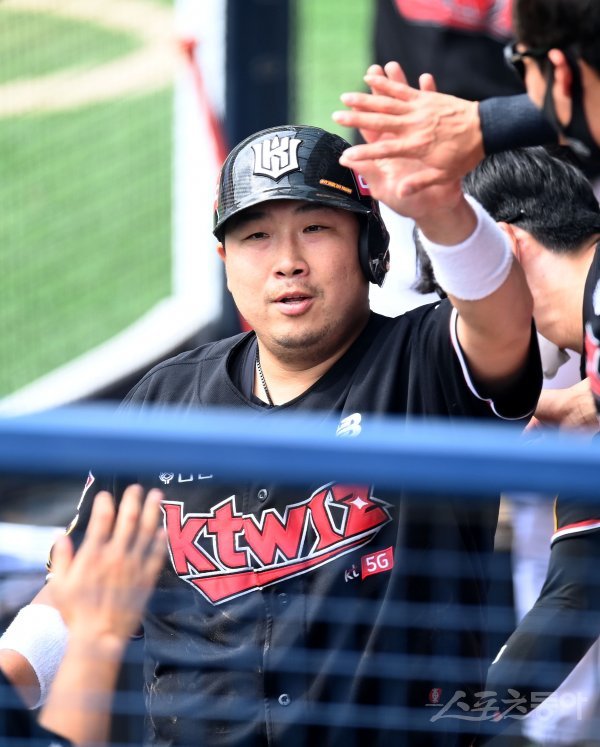 5일 서울 잠실야구장에서 ‘2021 신한은행 SOL KBO리그’ KT 위즈와 LG 트윈스 경기가 열렸다. 3회초 무사 1,3루 KT 내야 땅볼 때 득점한 3루주자 허도환이 더그아웃에서 하이파이브 하고 있다. 잠실 | 김종원 기자 won@donga.com