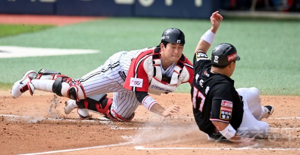 5일 서울 잠실야구장에서 ‘2021 신한은행 SOL KBO리그’ KT 위즈와 LG 트윈스 경기가 열렸다. 3회초 무사 1,3루 KT 내야 땅볼 때 3루주자 허도환이 홈으로 달려 세이프 되고 있다. 잠실 | 김종원 기자 won@donga.com