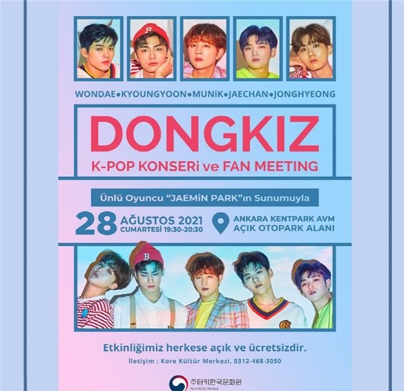 주터키한국문화원(원장 박기홍)은 한국의 5인조 남성 아이돌 그룹 동키즈의 K-Pop 콘서트 및 팬미팅을 8월28일 오후 7시30분(현지시간) 앙카라의 켄트파크백화점 야외공연장에서 온·오프라인 하이브리드로 개최했다.5000여 한류 팬 참여, 문화원 행사 역대 최다 인원