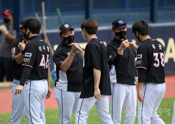 5일 서울 잠실야구장에서 ‘2021 신한은행 SOL KBO리그’ KT 위즈와 LG 트윈스 경기가 열렸다. 11-0 완승을 거둔 KT 선수들이 이강철 감독과 하이파이브 하고 있다.