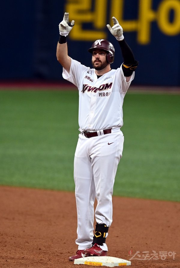 7회말 2사 1, 2루에서 키움 크레익이 2타점 2루타를 날린 뒤 세리머니를 펼치고 있다.