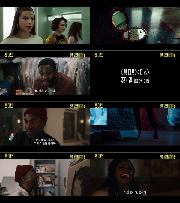 공개된 예고편은 학교 화장실에서 재미삼아 ‘캔디맨’을 불러보는 학생들의 모습으로 시작한다. ‘캔디맨’을 5번 모두 부르고도 아무 일도 일어나지 않자 시시해하는 학생들은 갑자기 잠겨버린 문에 당황하고, 이후 끔찍한 비명소리와 거울을 통해 얼핏 비친 ‘캔디맨’의 모습이 드러나며 ‘캔디맨’ 도시괴담에 대한 호기심을 자극한다. 이후 장면은 시카고 카브리니 그린으로 이사 온 천재 비주얼 아티스트 ‘안소니(야히아 압둘 마틴 2세)’가 예술적 영감을 위해 ‘캔디맨’을 조사하던 중 한 마을 주민을 만나며 더 격화된다. 그에게서 ‘캔디맨’의 숨은 이야기를 듣게 된 ‘안소니’는 전시회를 열어 모두에게 ‘캔디맨’을 알리고자 하고, 경고를 무시한 채 ‘캔디맨’을 부른 이들이 하나씩 끔찍한 상황에 처하며 과연 어떤 일이 벌어진 것일지 궁금하게 만든다. 특히 시간이 갈수록 이성을 잃은 듯한 인물들의 모습은 공동각본과 제작을 맡은 조던 필 유니버스 특유의 미스터리한 매력을 잘 살리고 있어 예비 관객들의 기대를 더욱 높이고 있다.