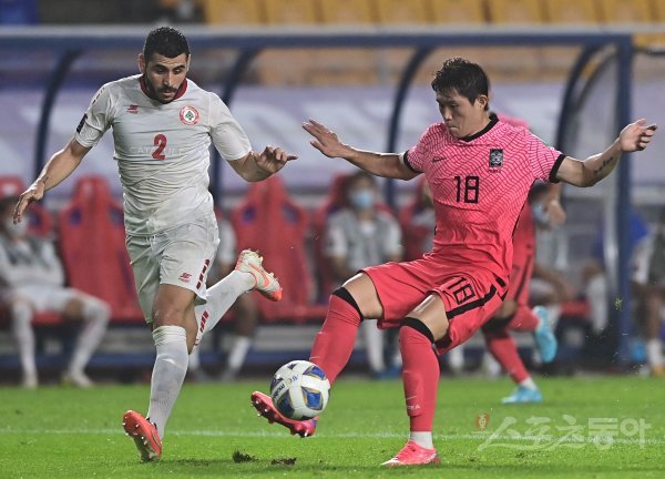 7일 경기도 수원월드컵경기장에서 열린 ‘2022 FIFA 카타르 월드컵’ 아시아지역 최종예선 A조 2차전 한국과 레바논의 경기에서 한국 이동경이 드리블 돌파를 하고 있다. 수원 | 주현희 기자 teth1147@donga.com