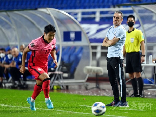 7일 경기도 수원월드컵경기장에서 열린 ‘2022 카타르월드컵’ 아시아 최종예선 한국과 레바논의 경기에서 한국 벤투 감독이 경기를 지켜보고 있다. 수원 | 김민성 기자 marineboy@donga.com