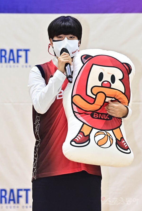 8일 경기도 용인실내체육관에서 열린 ‘2021-2022 WKBL 신입선수 선발회’에서 2라운드 5순위로 BNK에 지명된 온양여고 이주하가 소감을 말하고 있다.