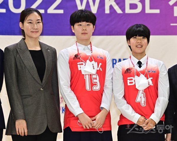 8일 경기도 용인실내체육관에서 열린 ‘2021-2022 WKBL 신입선수 선발회’에서 BNK 박정은 감독, 2라운드 1순위 최민주, 2라운드 5순위 이주하가 기념 촬영을 하고 있다.