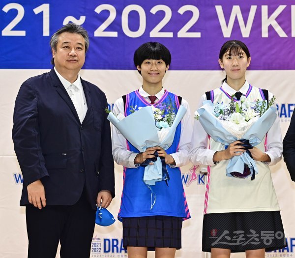 8일 경기도 용인실내체육관에서 열린 ‘2021-2022 WKBL 신입선수 선발회’에서 삼성생명 임근배 감독, 1라운드 1순위 이해란, 1라운드 6순위 임규리가 기념 촬영을 하고 있다.