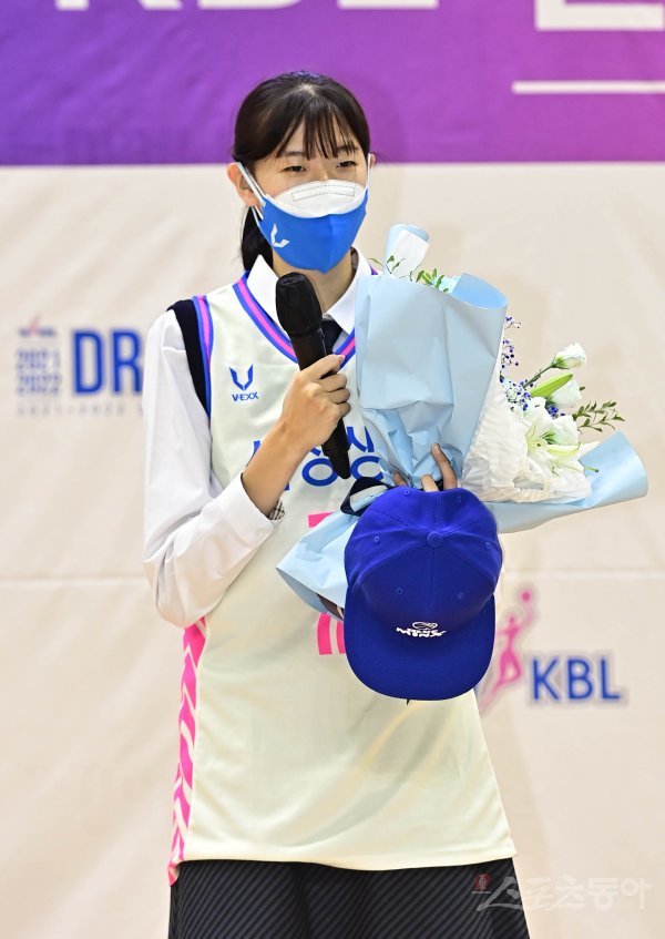 8일 경기도 용인실내체육관에서 열린 ‘2021-2022 WKBL 신입선수 선발회’에서 1라운드 6순위로 삼성생명에 지명된 청주여고 임규리가 소감을 말하고 있다.