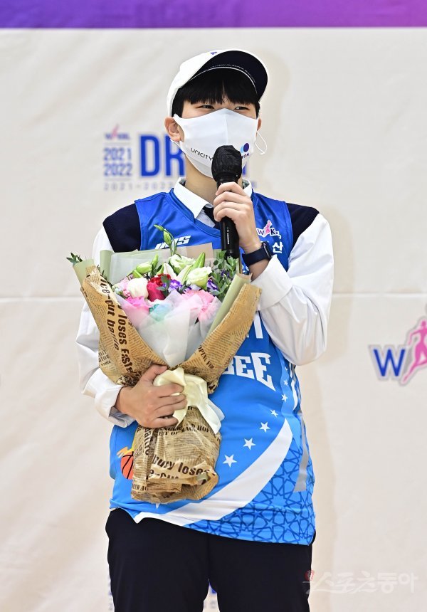 8일 경기도 용인실내체육관에서 열린 ‘2021-2022 WKBL 신입선수 선발회’에서 2라운드 2순위로 우리은행에 지명된 춘천여고 김은선이 소감을 말하고 있다.