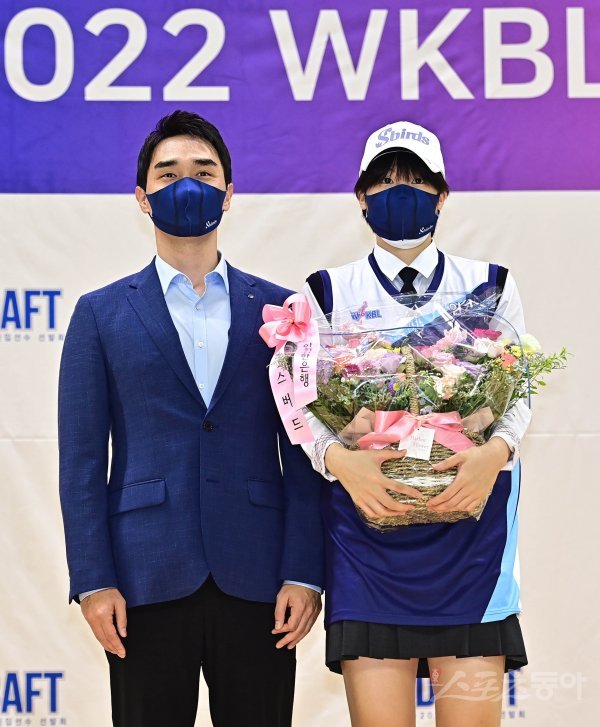 8일 경기도 용인실내체육관에서 열린 ‘2021-2022 WKBL 신입선수 선발회’에서 1라운드 3순위로 지명된 분당경영고 변소정이 신한은행 구나단 감독대행과 기념 촬영을 하고 있다.