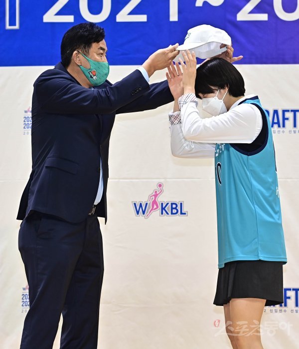 8일 경기도 용인실내체육관에서 열린 ‘2021-2022 WKBL 신입선수 선발회’에서 1라운드 2순위로 지명된 분당경영고 박소희가 하나원큐 이훈재 감독으로부터 모자를 받고 있다.