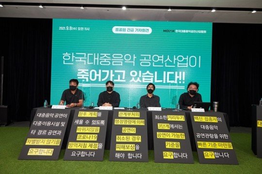 한국대중음악공연산업협회(음공협)가 신종 코로나바이러스 감염증(코로나19) 확산으로 인한 대중음악 공연계 피해를 호소하며 정부의 대책을 촉구했다. 8일 온라인 기자회견을 연 음공협은 “대중음악 공연산업은 문화 다중이용 시설과 여타 공연 장르와 달리 1년 5개월 동안 정상적인 공연을 할 수 없었다”며 “문화 다중이용시설 및 타 장르 공연과 차별하지 말 것”을 주장했다. 이어 ”공연이 당국의 행정명령으로 취소되면 피해를 보상해주고, 사회적 거리두기 3단계에서 공연이 가능한 기준을 마련해 달라고 정부에 요구했다.