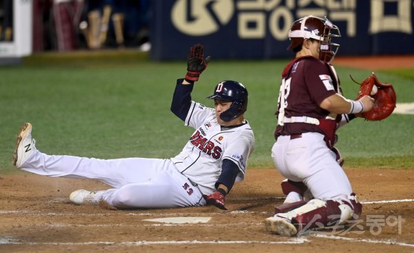 4회말 1사 만루 두산 외야 뜬공 때 3루주자 양석환이 태그업 시도해 홈에서 세이프 되고 있다.