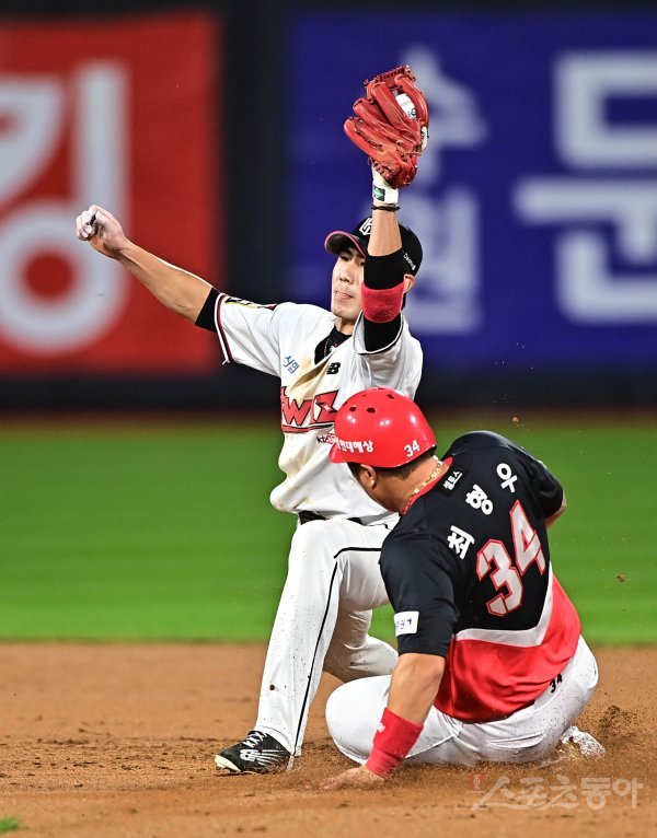 8일 경기도 수원KT위즈파크에서 ‘2021 신한은행 SOL KBO리그’ KT 위즈와 KIA 타이거즈의 경기에서 7회초 무사 1루 KIA의 번트 때 KT 유격수 심우준이 1루주자를 포스 아웃시키고 있다.