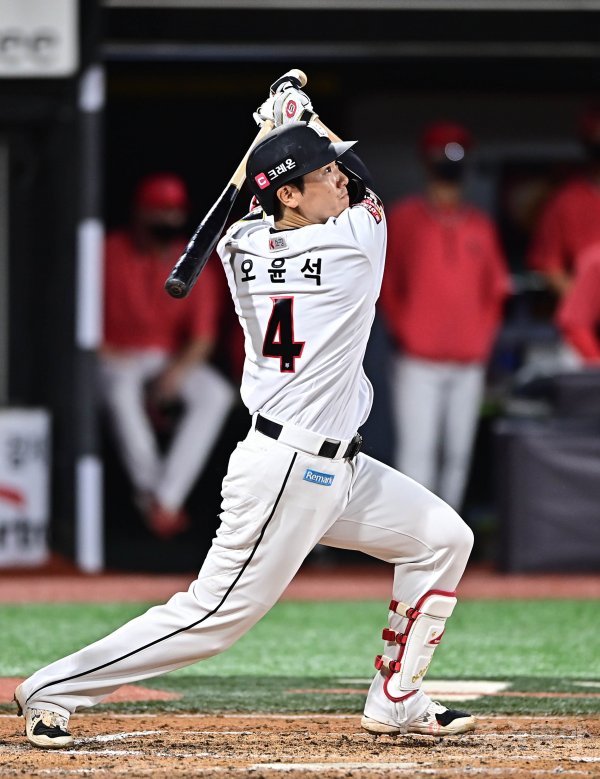 8일 경기도 수원KT위즈파크에서 ‘2021 신한은행 SOL KBO리그’ KT 위즈와 KIA 타이거즈의 경기에서 6회말 무사 1루 KT 오윤석이 동점 우월 2점 홈런을 치고 있다.