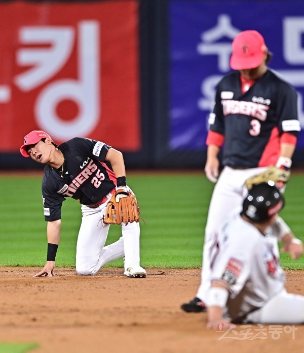 8일 경기도 수원KT위즈파크에서 ‘2021 신한은행 SOL KBO리그’ KT 위즈와 KIA 타이거즈의 경기에서 5회말 무사 1루 KT의 내야 땅볼 때 KIA 유격수 박찬호가 타구를 놓친 뒤 아쉬워하고 있다.