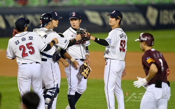 7-1 승리를 거둔 두산 선수들이 하이파이브 하고 있다.